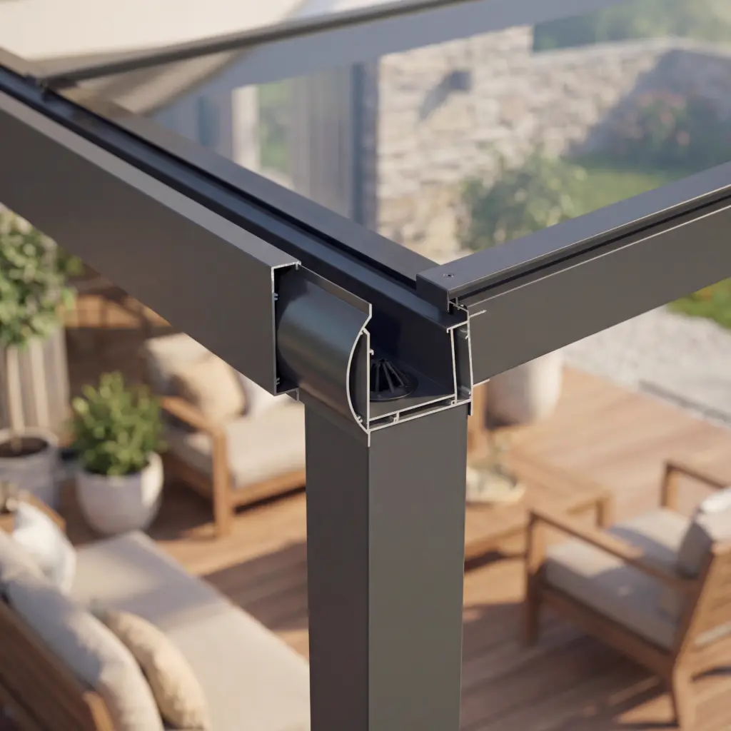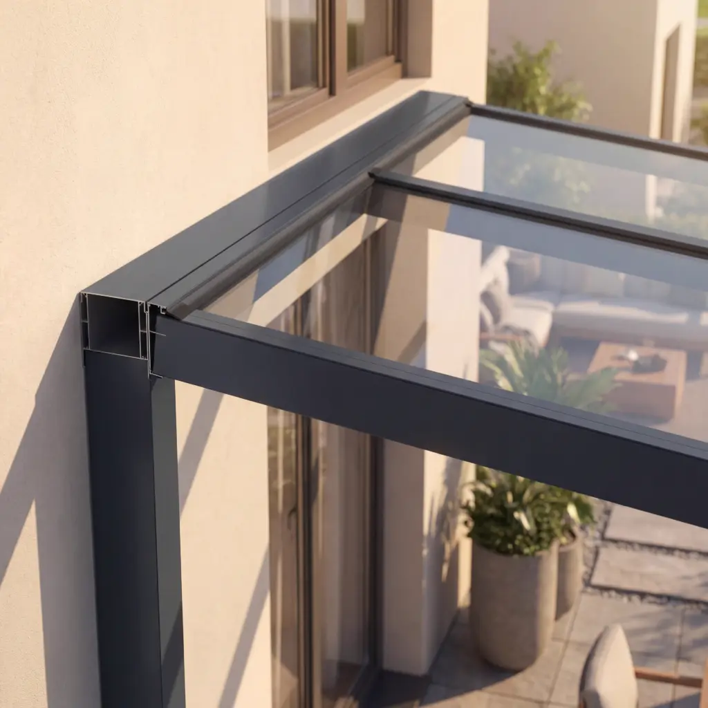 Die hochwertige Pulverbeschichtung sorgt dabei für dauerhafte Farbstabilität, zuverlässigen Wetterschutz und eine gleichmäßige, hochwertige Oberfläche, passend zum gesamten Sortiment von JH Terrassenüberdachungen.